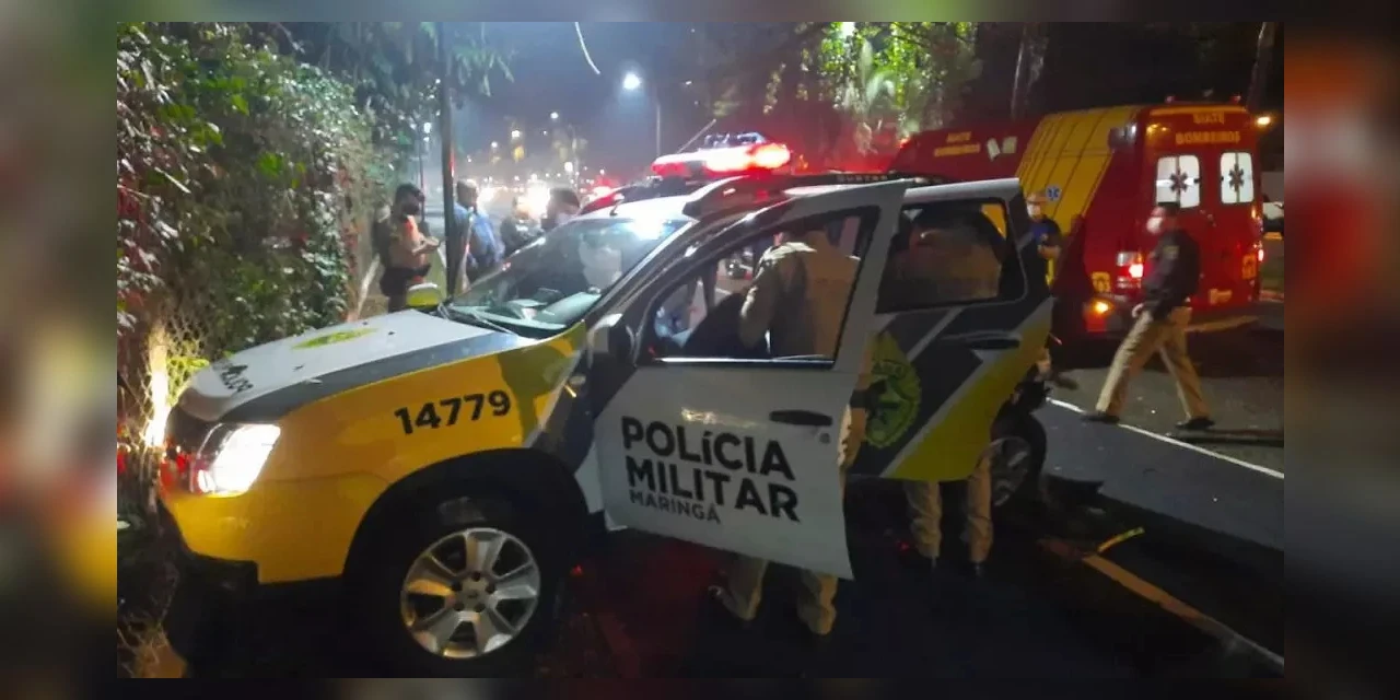 Um motorista bêbado bateu na traseira de uma viatura da Polícia Militar de Maringá na noite do último sábado (17). O acidente aconteceu na Avenida São Paulo, perto do Parque do Ingá, Zona 2 da cidade. Os policiais que estavam na viatura ficaram feridos e precisaram ser encaminhados para o hospital.