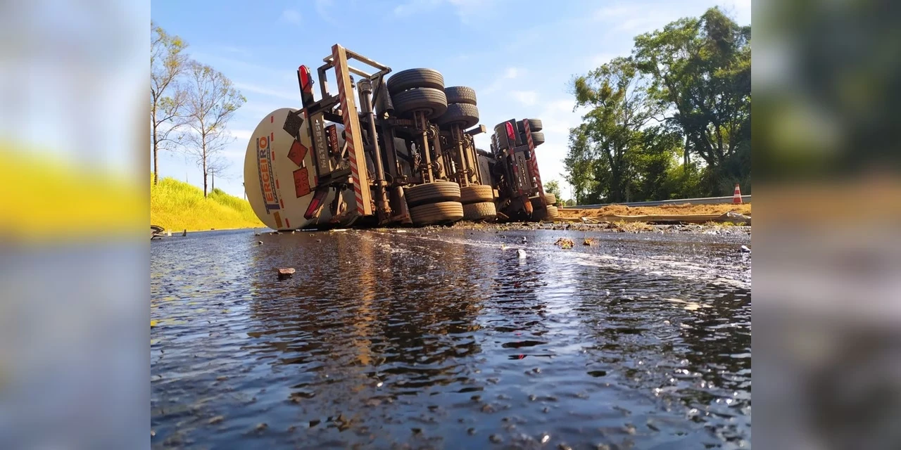 Um motorista de caminhão tanque carregado com aproximadamente 43 mil litros de diesel ficou ferido após o veículo tombar na BR-376, no contorno sul de Apucarana, no norte do Paraná, nesta sexta-feira (30).