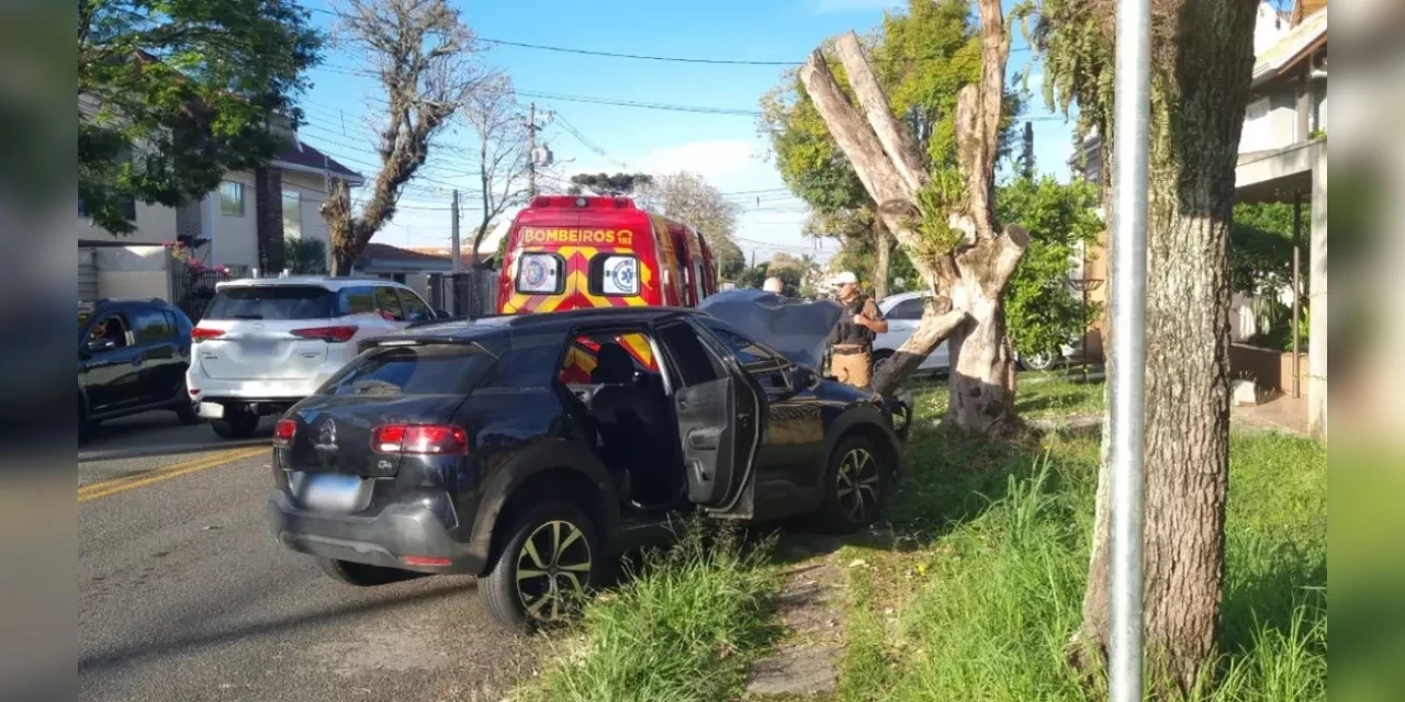 Em certo momento, a mulher notou o animal preso na roupa. O carro, modelo Citroen C3, só parou ao colidir contra uma árvore.