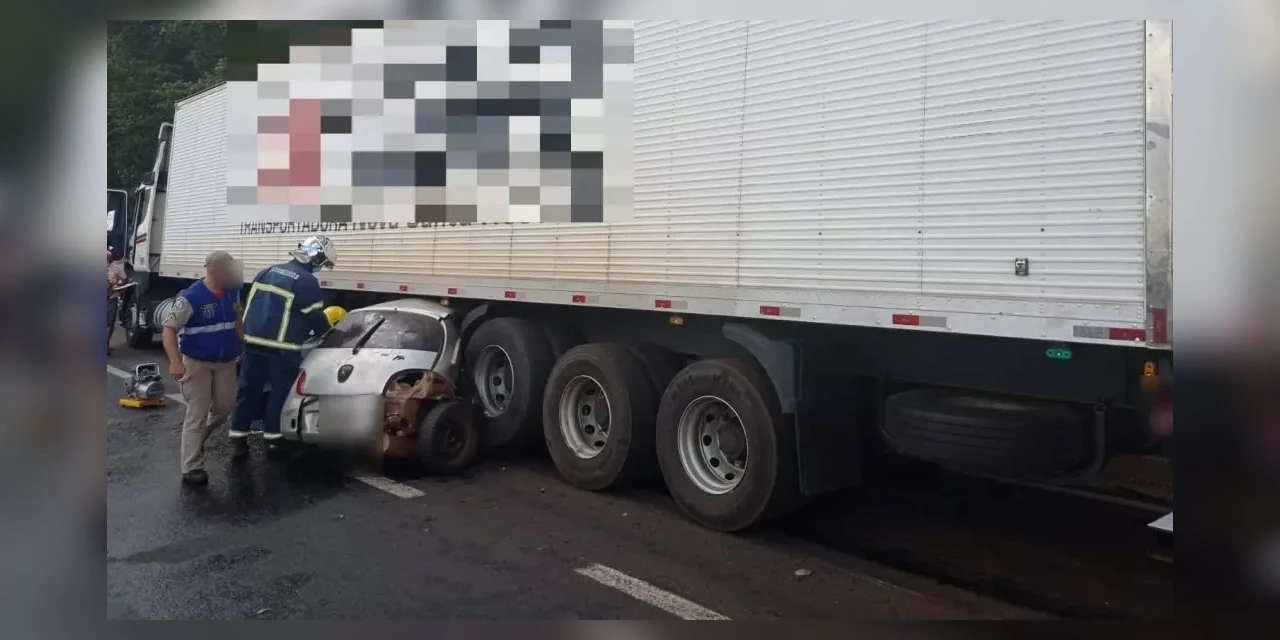 A Polícia Rodoviária Estadual (PRE) informou que a motorista perdeu o controle do carro, um Ford KA, e colidiu contra a sinalização que estava na margem da pista. O automóvel continuou em movimento e ficou com a parte da frente entre as rodas do caminhão.