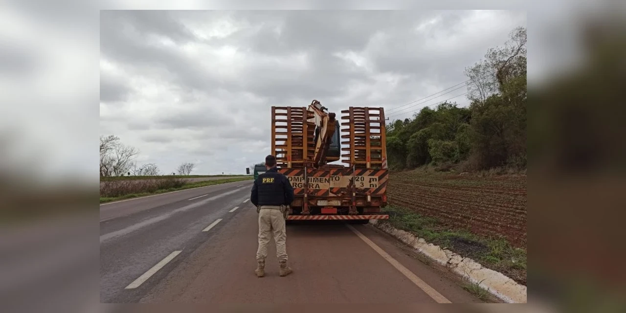 Um caminhoneiro foi impedido de continuar a transportar uma escavadeira, por conta da falta de segurança, nesta quarta-feira (6), na BR-163, em Toledo, no oeste do Paraná. O caminhão, que estava em mau estado de conservação, carregava a máquina de 19 toneladas sem nenhuma amarração.