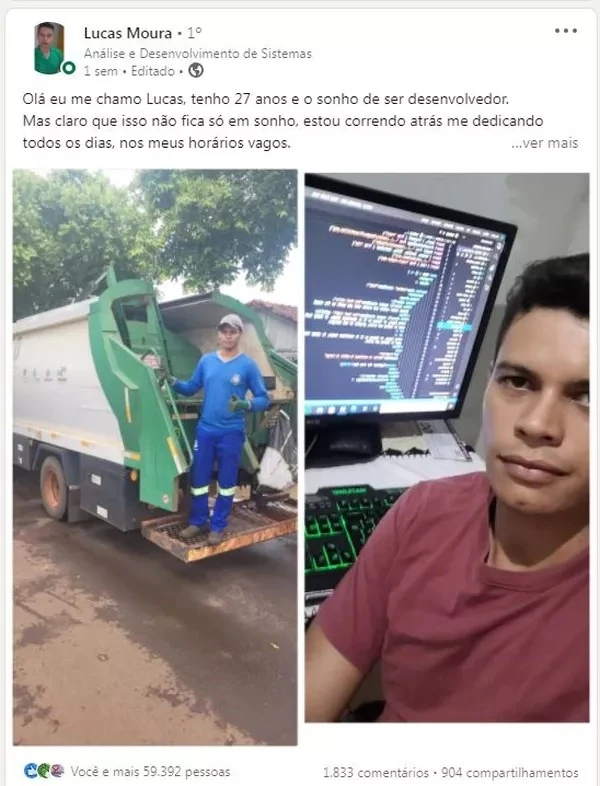 Persistência e foco foram os principais combustíveis que motivaram o paranaense Lucas da Silva Moura, de 27 anos, na luta pela transição de profissão. Trabalhando como coletor de lixo por 7 anos em Esperança Nova, no noroeste do estado, ele se dedicou nas horas vagas para realizar um sonho antigo: trabalhar com tecnologia. E conseguiu.