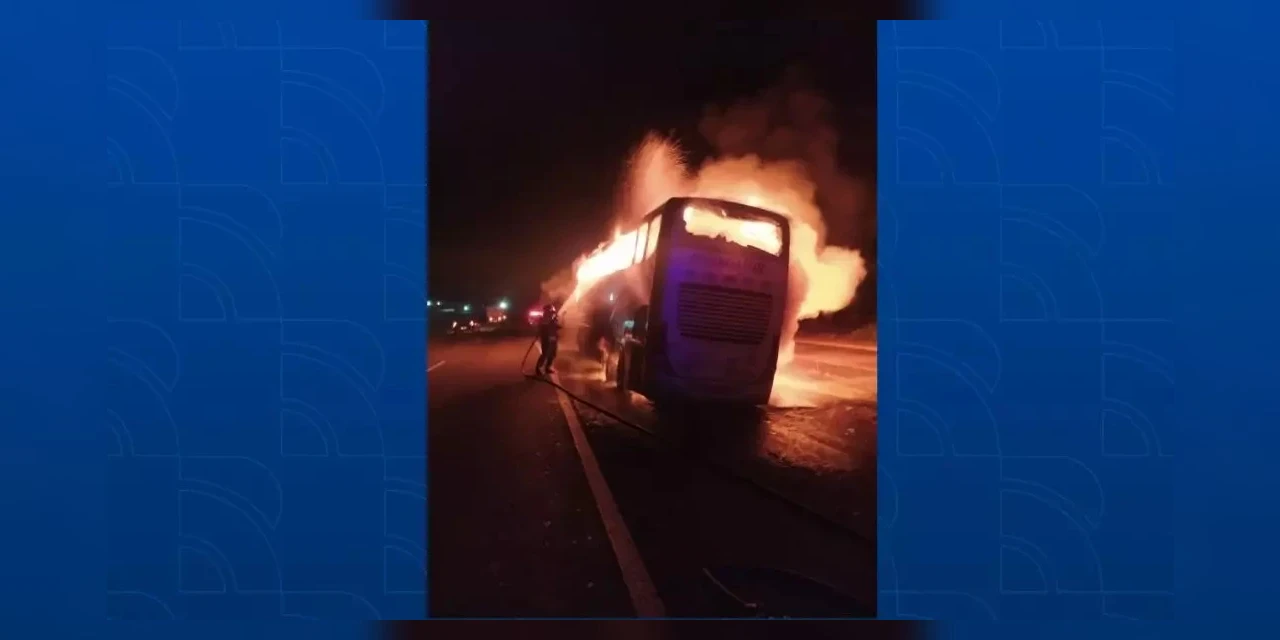 Um ônibus de turismo ficou totalmente destruído após pegar fogo na PR-323, em Paiçandu, na noite desta quinta-feira (13). Nenhum dos 33 ocupantes do veículo se machucou.