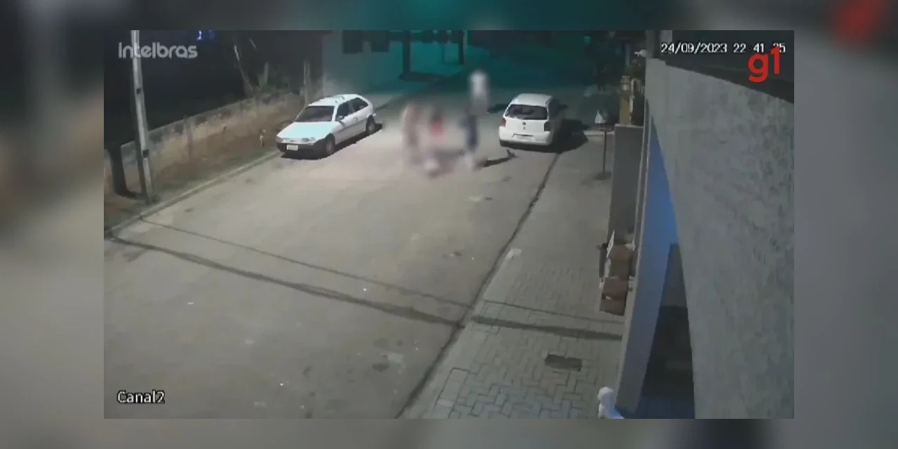 A briga entre pai e filho aconteceu no meio da rua, no centro da cidade, e foi filmada por uma câmera de segurança. As imagens são fortes e, por respeito ao leitor, o g1 borrou parte das imagens e congelou as cenas mais violentas.