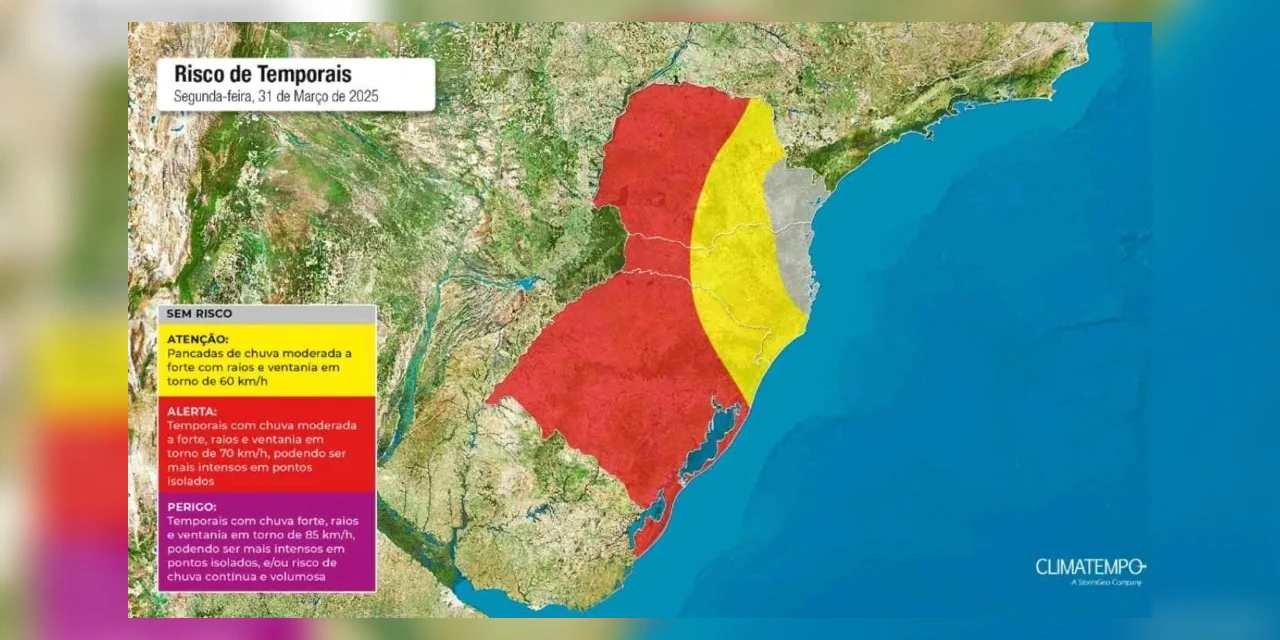 Já algumas cidades do Norte Pioneiro, da região sul e dos Campos Gerais, estão em atenção, com risco de chuvas moderadas e ventos de até 60 km/h. Em Curitiba e no litoral não há previsão de temporais nesta segunda (31).