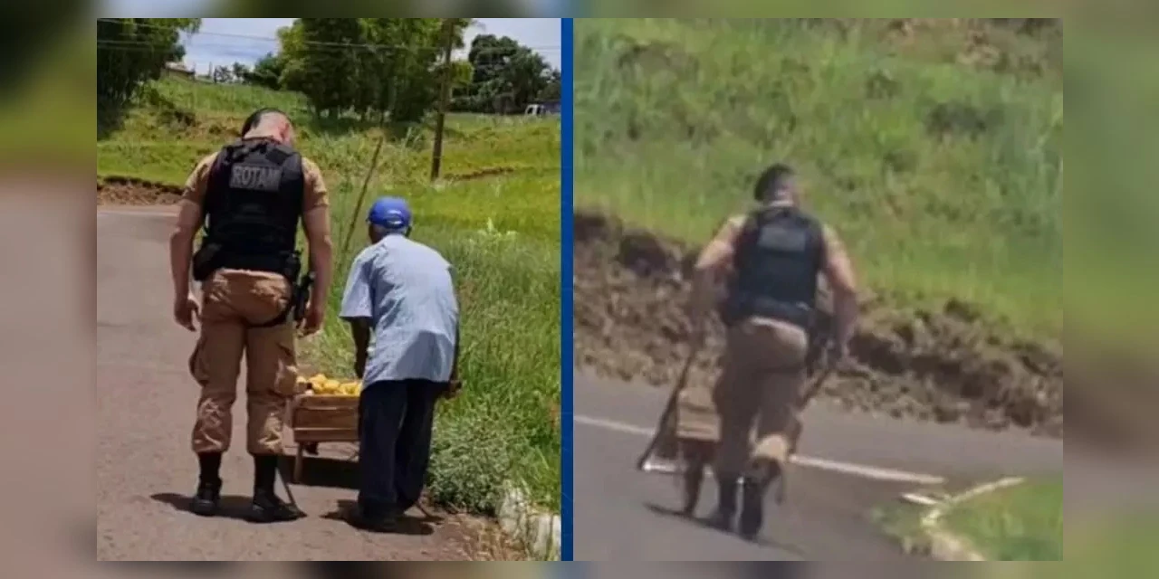 O vídeo de um policial militar transportando uma carriola tomou as redes sociais, nesta quinta-feira (20). O registro foi feito em Cambé, no norte do Paraná. Na tarde de quarta-feira (19), durante patrulhamento no bairro Tupi, os oficiais encontraram um idoso, de 80 anos, empurrando a carriola em uma ladeira e pararam para ajudá-lo. Quem filmou foi um dos policiais que estava na viatura.