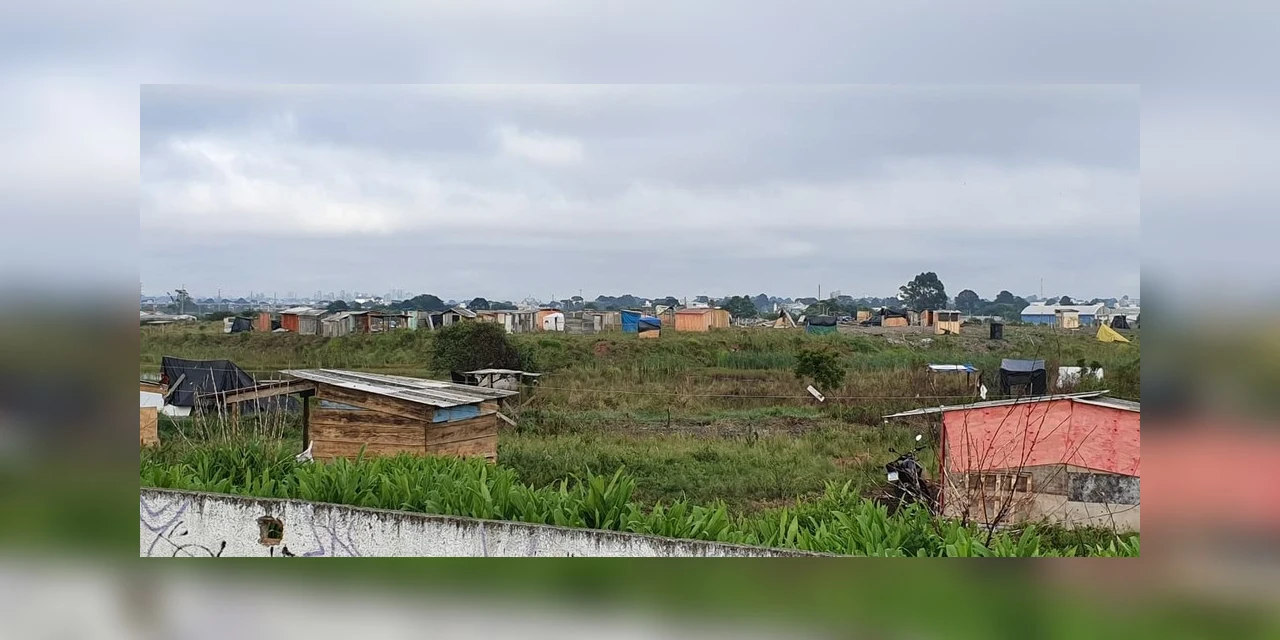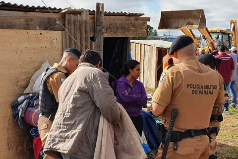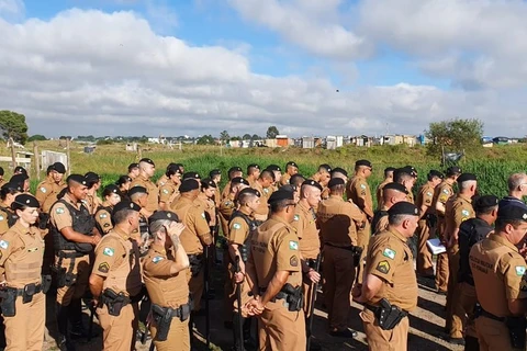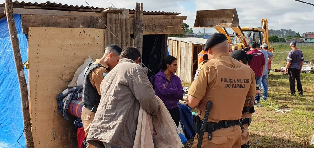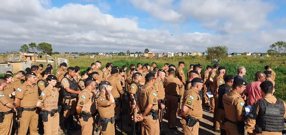 Policiais militares fazem, na manhã desta quinta-feira (12), uma reintegração de posse em Piraquara, na Região Metropolitana de Curitiba. Eles cumprem decisão para a retirada de moradores de um terreno da prefeitura.