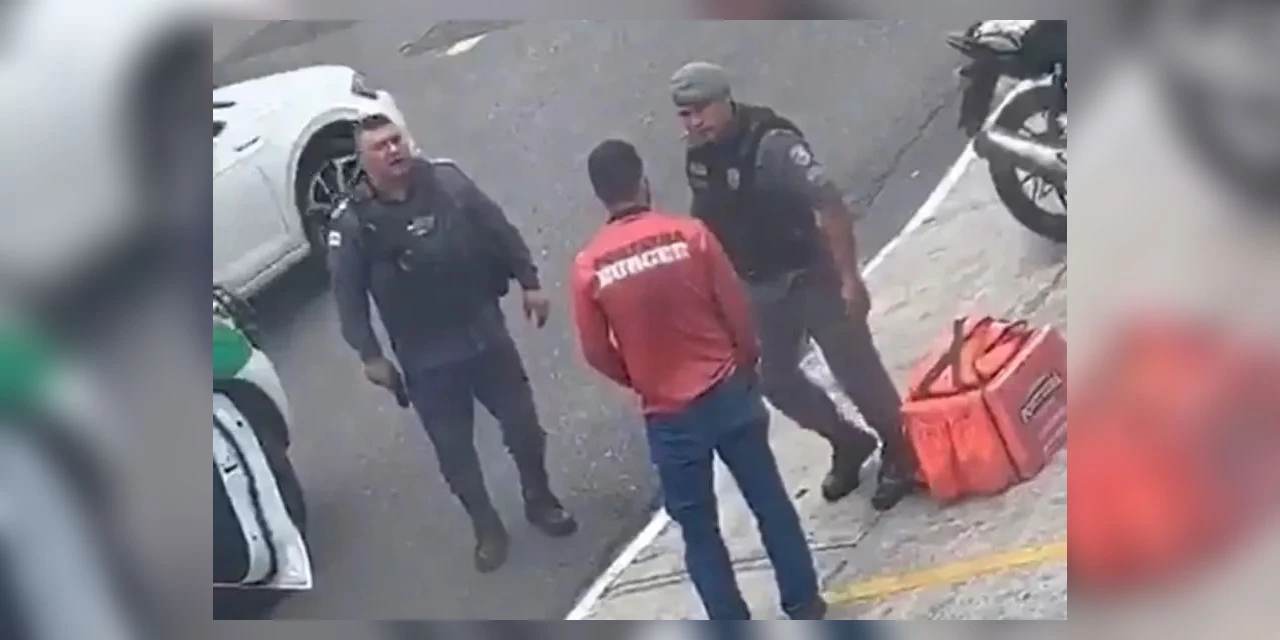 Nas imagens é possível ver que o motoboy está entre os dois agentes. Um deles está na rua com a arma em mãos e o outro está na calçada segurando a mochila vermelha que é usada nas entregas. Na sequência o policial diz “tá tirando onda com a polícia?”. Um dos policiais dá um tapa no braço do motoboy e pede a CNH dele. Neste momento, o policial rasga o documento e devolve ao entregador.