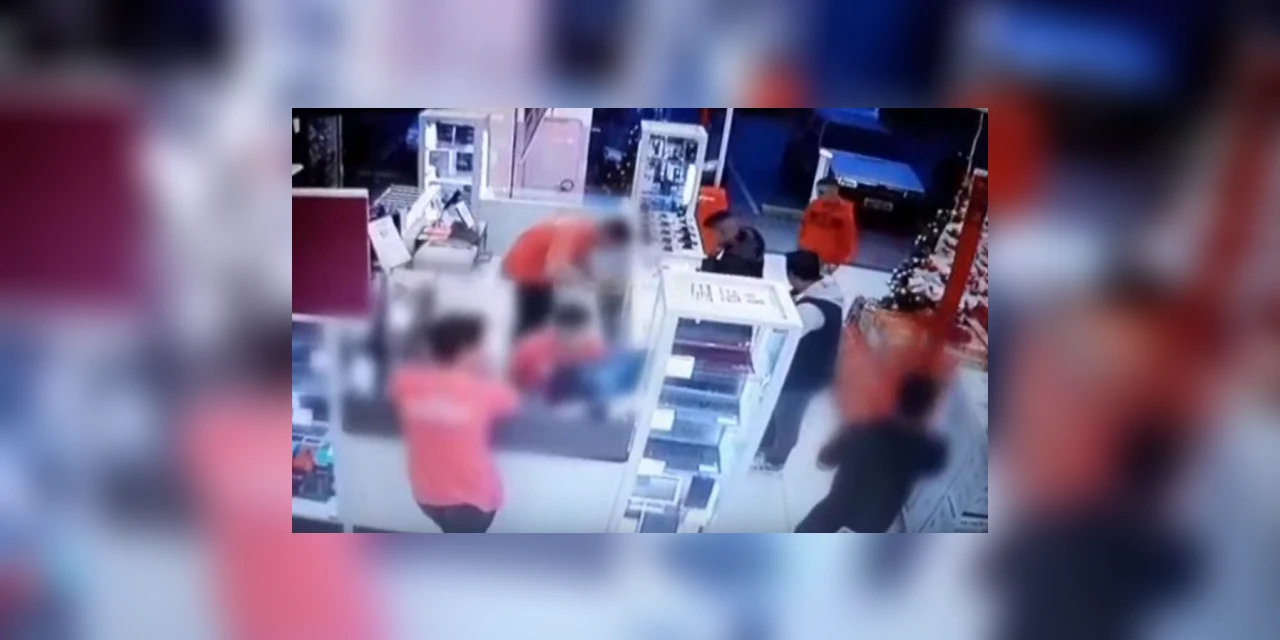 Câmeras de segurança mostram o momento que dois indivíduos entram na loja e fazem a limpa no caixa, levando também aparelhos de celular.