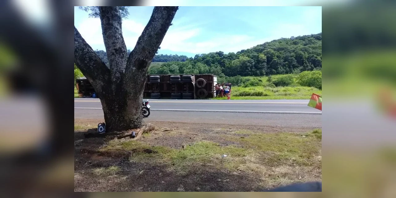Um caminhão carregado de pneus tombou na tarde desta terça-feira (23/11/2021) no quilômetro 464 da BR-277, em Laranjeiras do Sul.