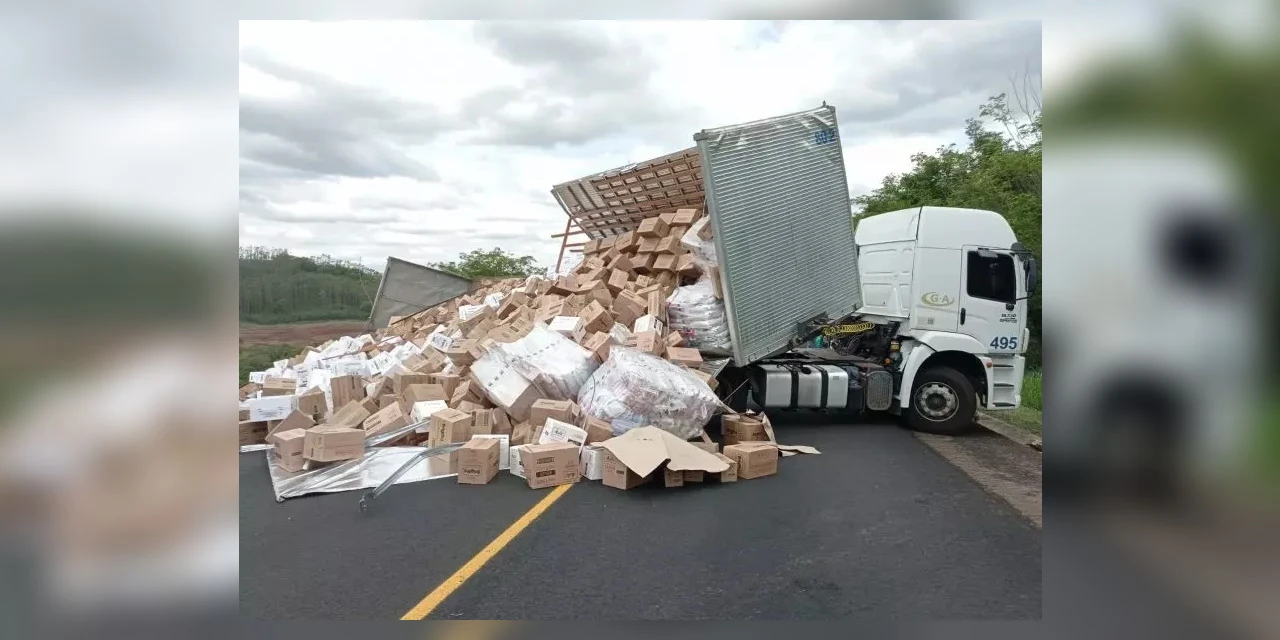 De acordo com informações da Polícia Rodoviária Estadual (PRE), a carreta vinha de Curitiba e iria descarregar os produtos em Londrina quando aconteceu o acidente. O motorista teria perdido o controle do veículo ao tentar desviar de um carro que invadiu a pista simples. A carroceria não aguentou a carga e acabou estourando.