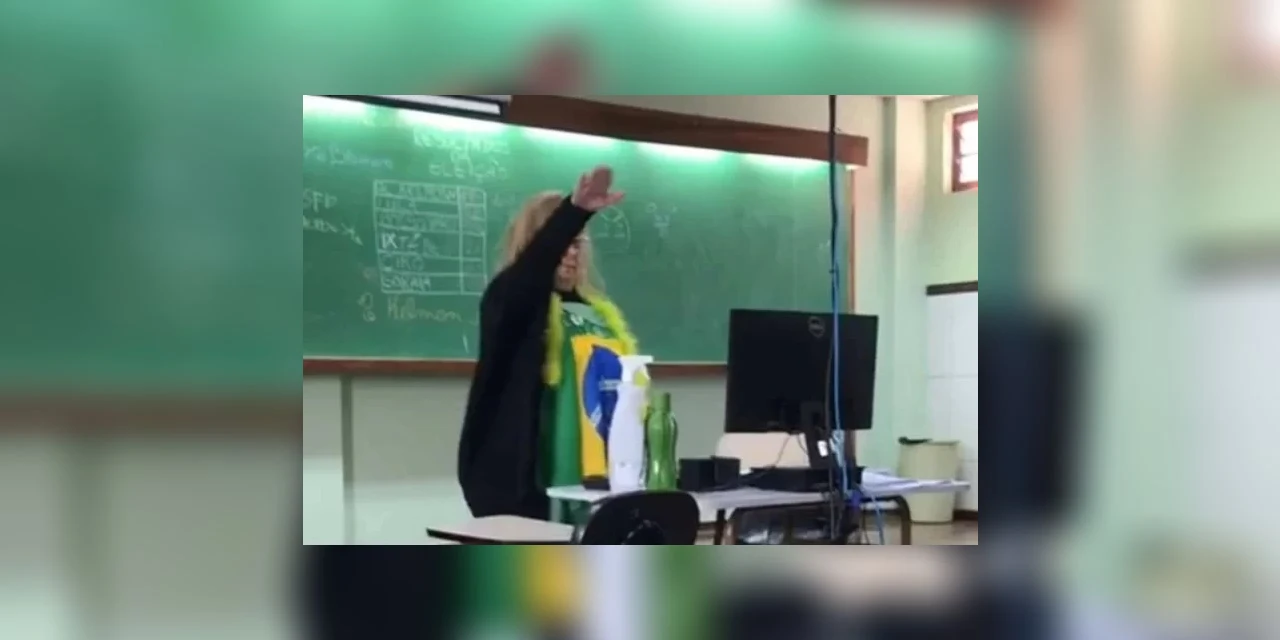Nas imagens é possível ver a professora fazendo um sinal de sentido antes de estender a mão direita para frente. O gesto era usado no período do nazismo na Alemanha, quando Adolf Hitler governou o país nas décadas de 1930 e 1940 e cometeu um genocídio contra mais de 6 milhões de judeus, perseguidos pelo regime.