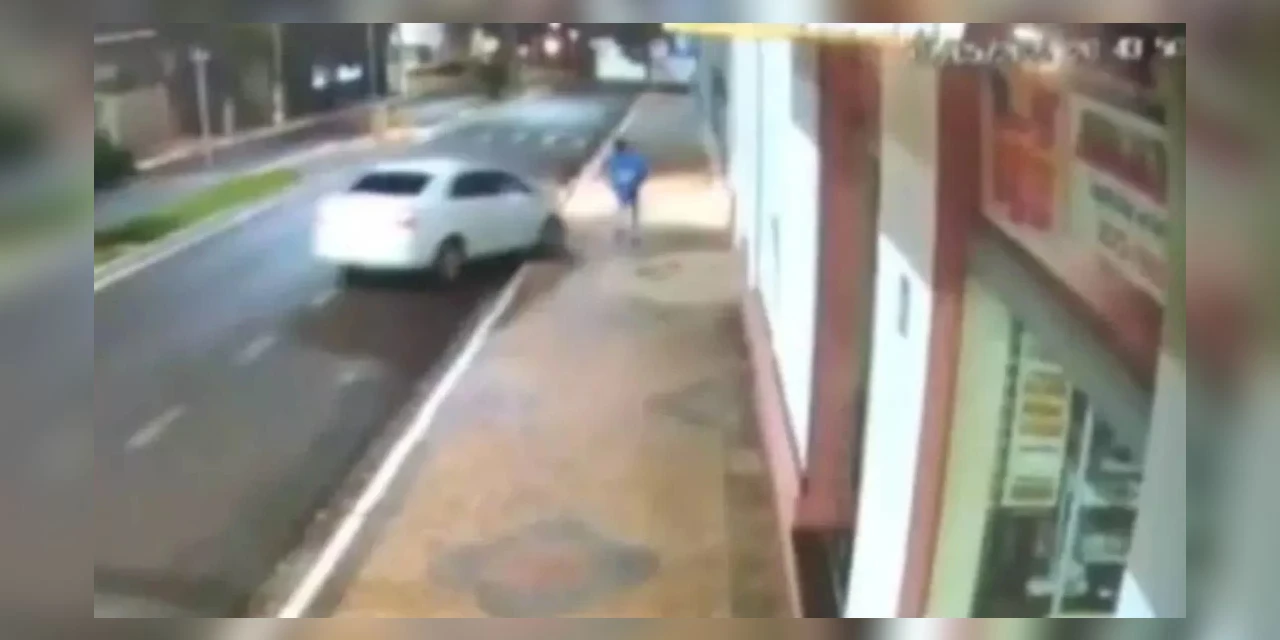 Pelas imagens é possível ver que o homem passa correndo pela calçada e logo é atingido por um carro que sobe a guia. Com a força da pancada, o suspeito é arremessado para dentro de uma garagem próxima.