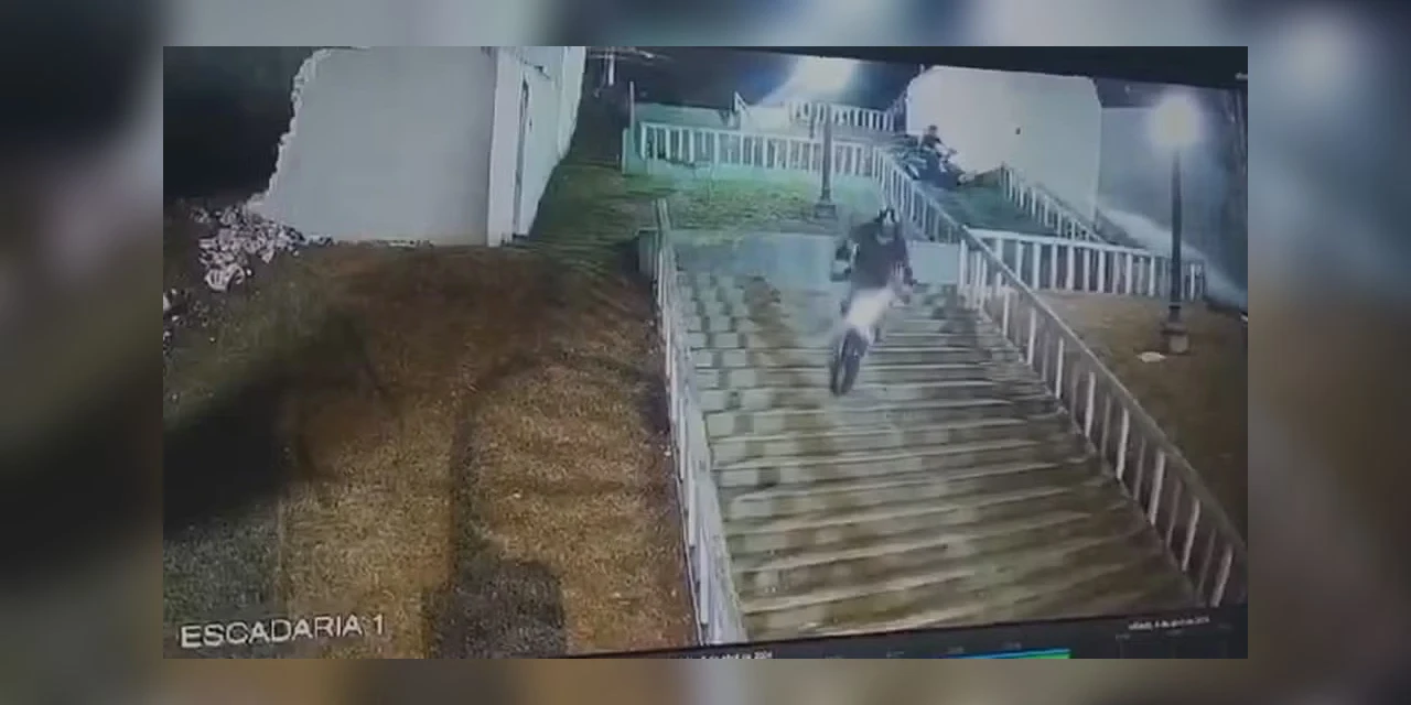 As imagens mostram ele descendo a escadaria que fica entre as ruas Paula Xavier e Balduíno Taques de moto.