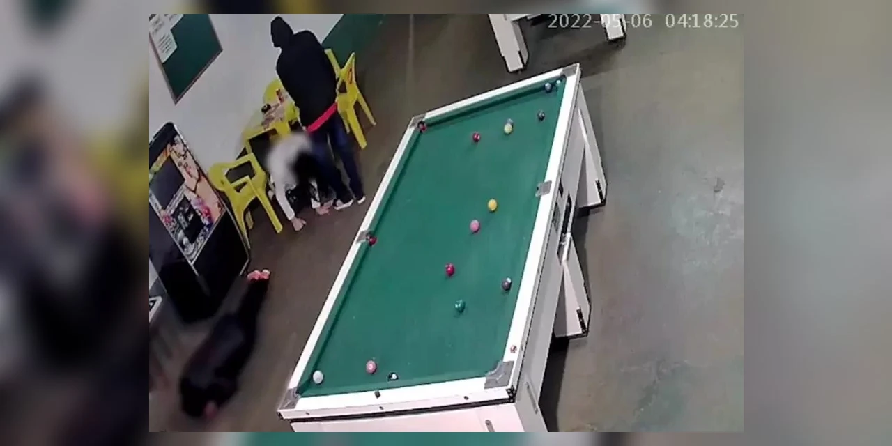 Dois homens estão jogando sinuca e duas mulheres sentadas, quando os assaltantes chegam. Eles fazem as vítimas deitarem no chão e na sequência, começam a pegar os objetos de valor.