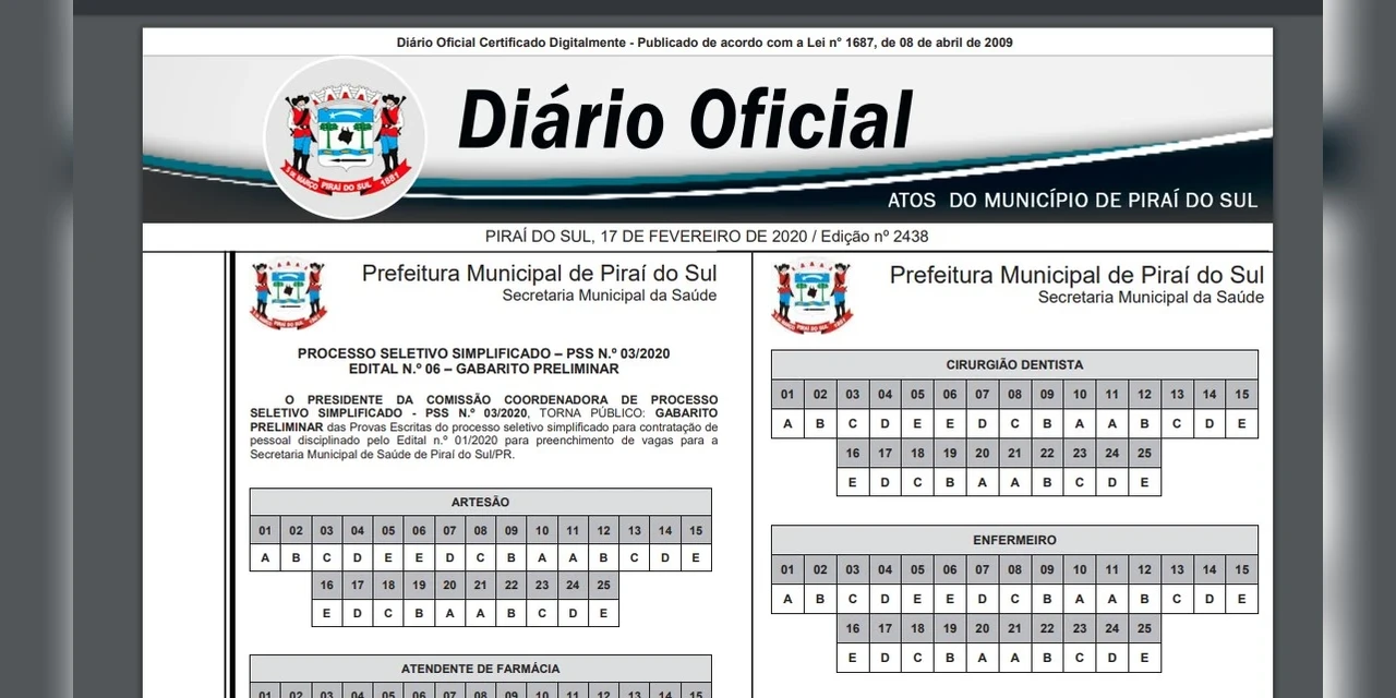 REDAÇÃO/Correio dos Campos - A prefeitura municipal de Piraí do Sul divulgou há poucos instantes, no Diário Oficial do Município, na internet, o gabarito oficial do Processo Seletivo Simplificado (PSS) que foi realizado na manhã de ontem (16), reunindo mais de 690 candidatos.