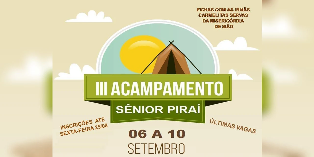 Participação - O acampamento sênior é destinado a pessoas solteiras que tenham 30 anos completos, ou para as casadas, a partir dos 25 anos de idade. O investimento é de R$ 160 para piraienses e R$ 200 para pessoas de outros municípios. As vagas anunciadas no início da divulgação foram limitadas a 96, podendo aumentar de acordo com a procura.
