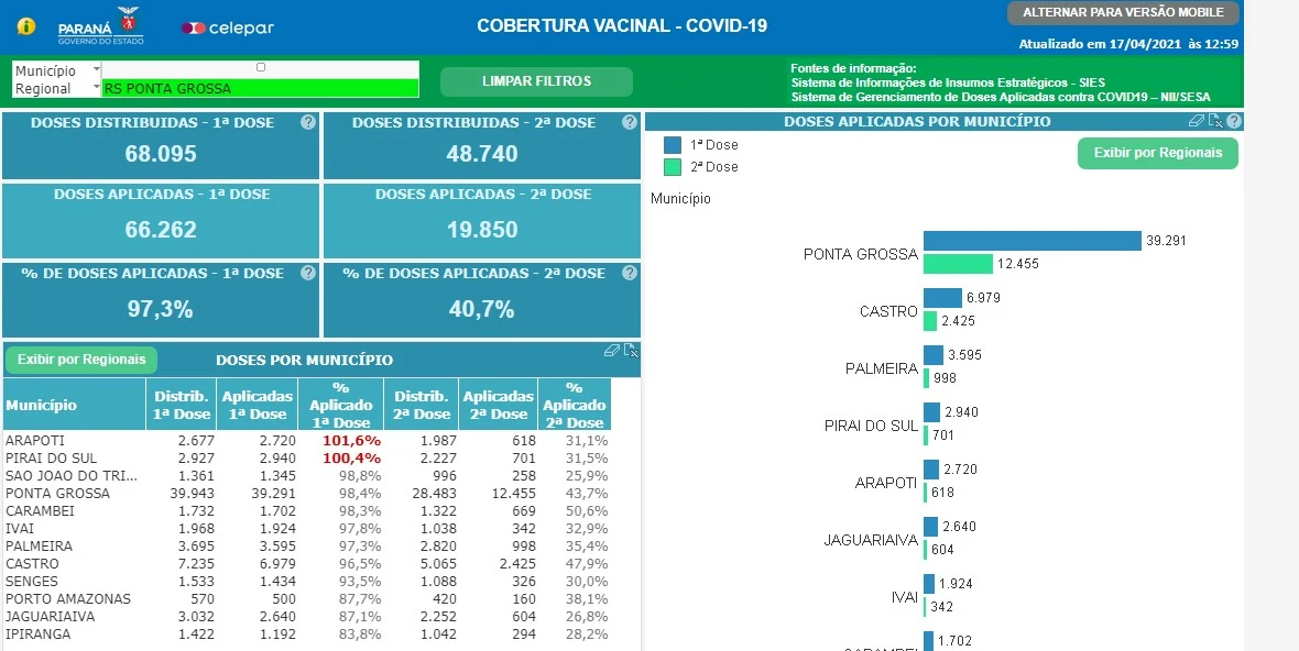 Dentro das 22 cidades que integram a 3ª Regional de Saúde de Ponta Grossa, Arapoti e Piraí do Sul aparecem em destaque, respectivamente, como primeiro e segundo municípios que mais aplicaram a primeira dose da vacina contra a Covid-19.