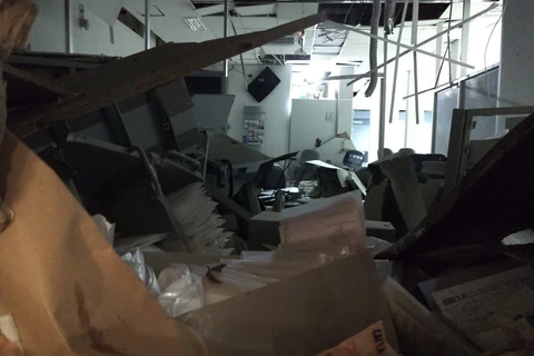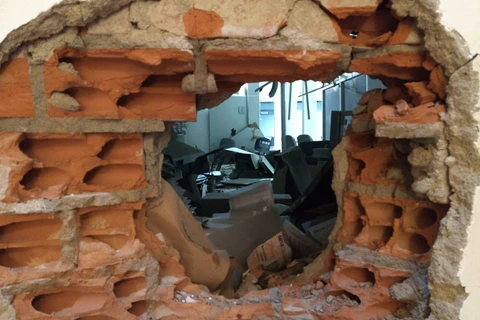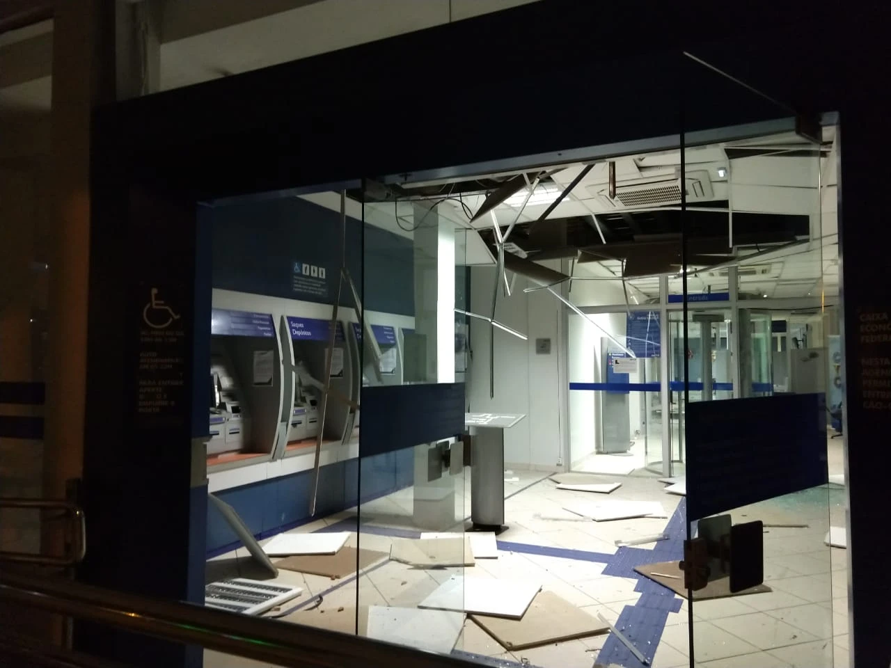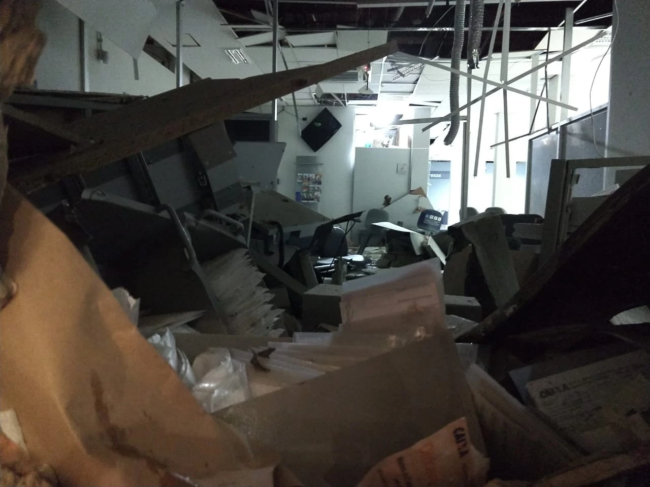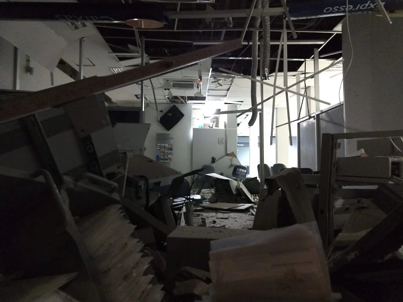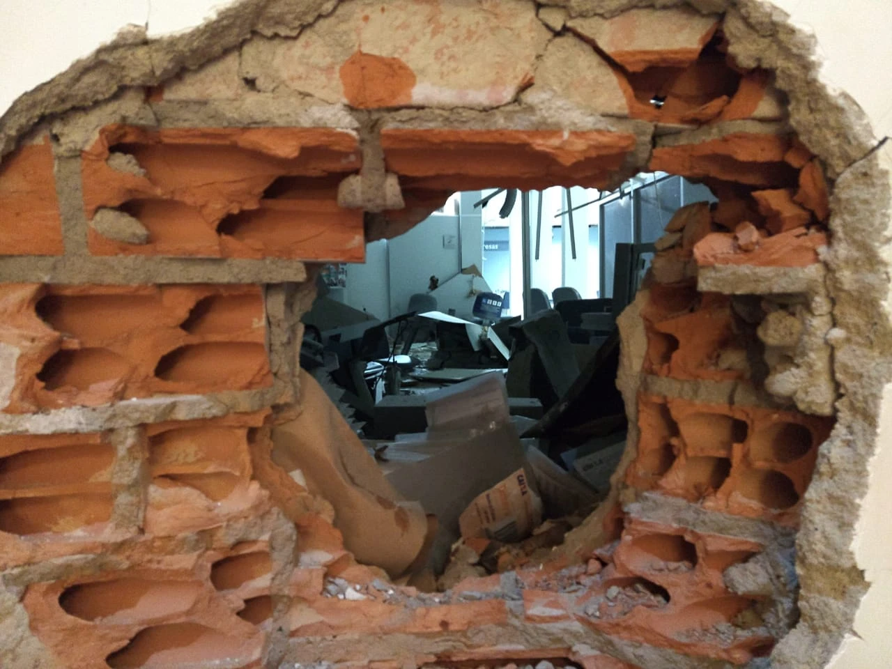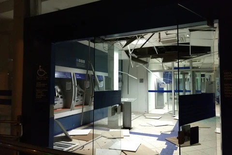 As explosões praticamente acabaram com o interior do banco, além de terem causado muito estrago na recepção do hotel que funciona no mesmo prédio da agência bancária.