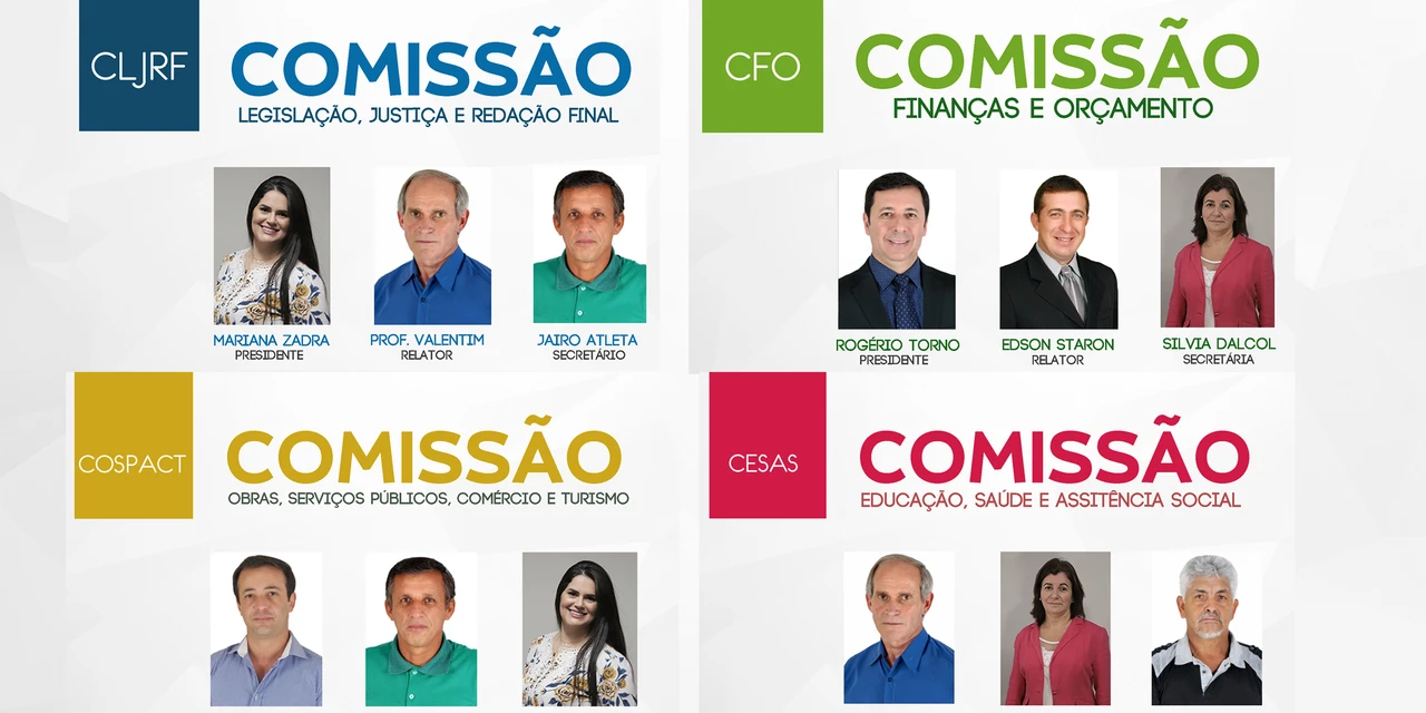O plenário deliberou que a Comissão de Legislação, Justiça e Redação Final (CLJRF), será presidida pela vereadora Mariana Zadra (PTC). A Comissão de Finanças e Orçamento (CFO) será conduzida pelo vereador Rogério Torno (MDB). Já a Comissão de Obras, Serviços Públicos, Agroindústria, Comércio e Turismo (Cospact) terá a presidência do vereador Rogério Santos (PSD). A Comissão de Educação, Saúde e Assistência Social (Cesas) contará com a direção do vereador Professor Valentim (PSD).
