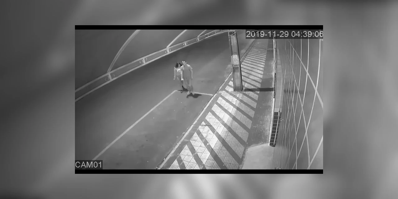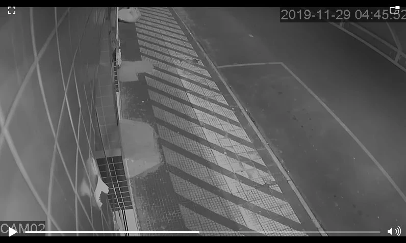 As gravações mostram claramente o momento em que o casal se aproxima da loja, por volta das 04h30 da manhã. Poucos minutos depois, outra câmera do estabelecimento flagra quando uma trouxa de roupas é jogada pela dupla para o passeio da via.