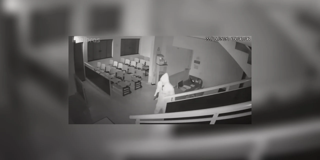 No primeiro corte, ele aparece ainda do lado de fora da clínica, pouco antes de entrar no local e retirar uma televisão que estava fixada na parede. Depois disso, ele vai até uma das mesas do piso térreo da empresa, aparecendo logo em seguida com um notebook nas mãos.