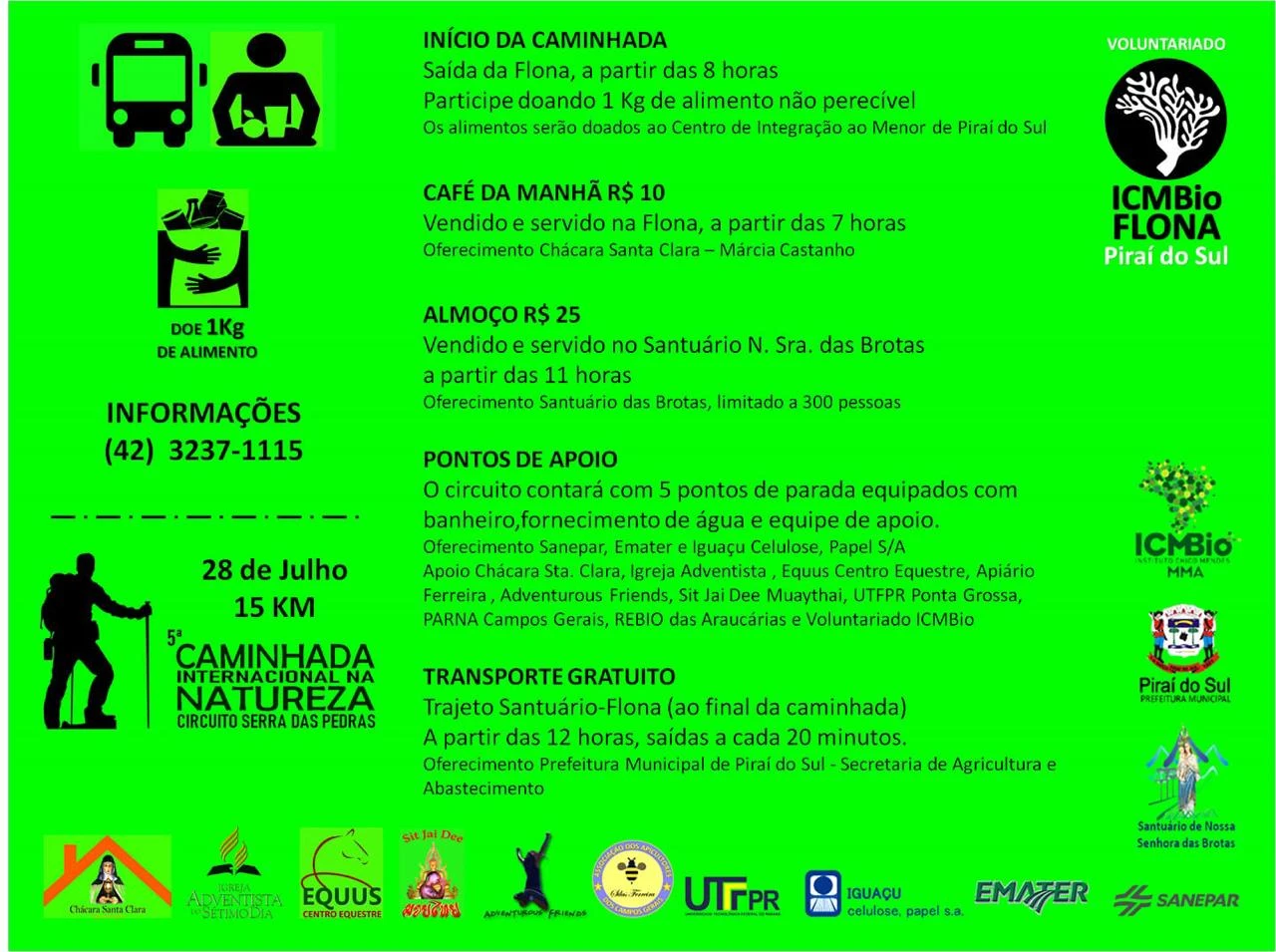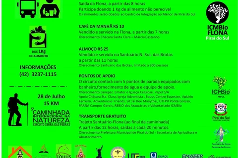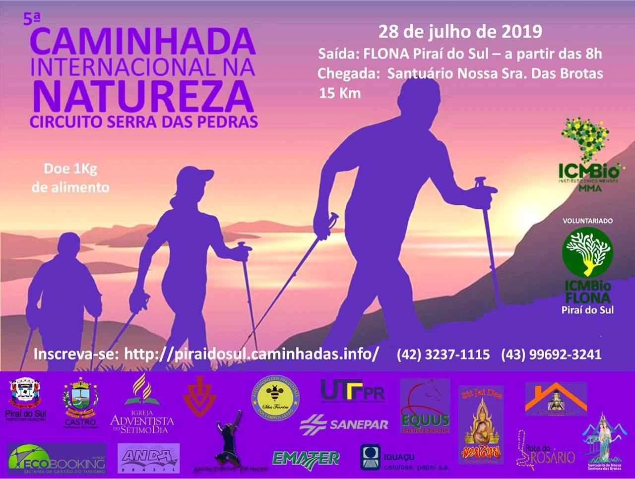 Toninho Anhaia/Piraí do Sul - O Instituto Chico Mendes de Conservação da Biodiversidade (ICMBio), com o apoio da Prefeitura Municipal de Piraí do Sul, Prefeitura de Castro, Emater e outros, realiza a 5º Caminhada Internacional na Natureza – Circuito Serra das Pedras no dia 28 de julho, a partir das 8 horas.