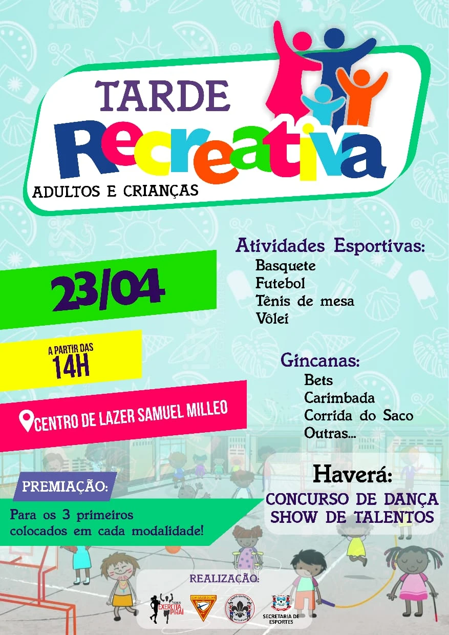 De acordo com a organização, a tarde contará com atividades esportivas nas modalidades de Vôlei, Tênis de Mesa, Basquete e Futebol, além de gincanas que preveem a realização de competições de Bets, Carimbada, Corrida do Saco e Concurso de Dança por Equipes, dentre outras.