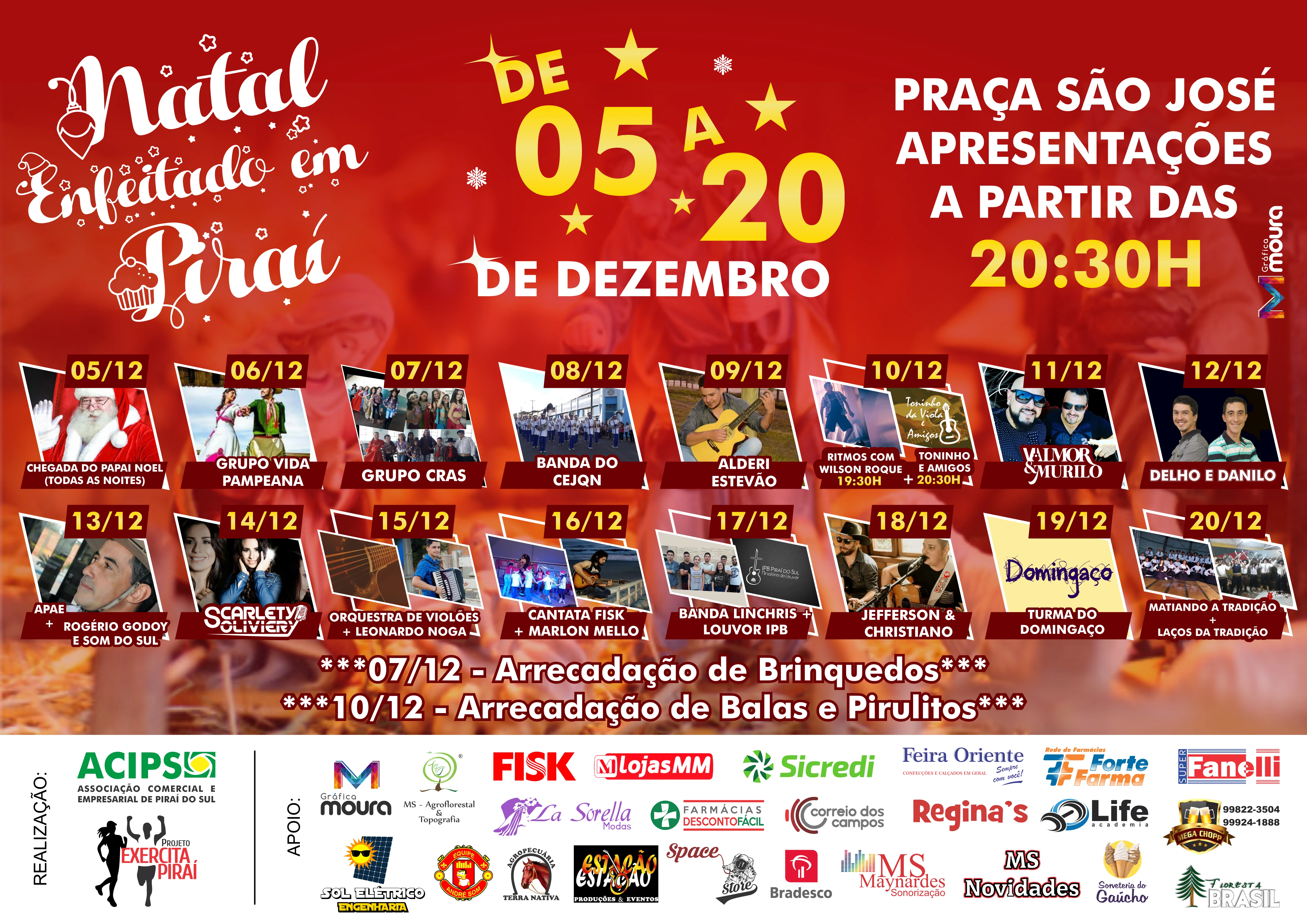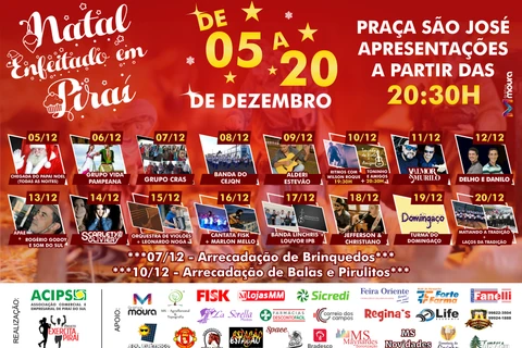 Promovido pela Associação Comercial e Industrial e pelo Projeto Exercita Piraí, com apoio de diversas empresas parceiras, o evento terá a casa do ‘bom velhinho’, instalada na Praça José Avais, aberta todas as noites para visitação, além de apresentações artísticas e culturais que acontecerão entre os dias 6 e 20 de dezembro.