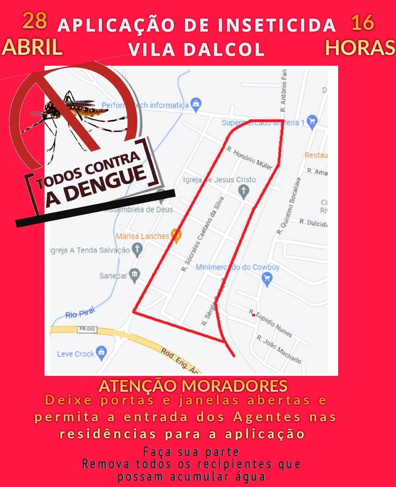 Segundo a Vigilância Sanitária, a aplicação do inseticida nas ruas da parte baixa do bairro deve acontecer amanhã, no mesmo horário, desde que não exista previsão de chuva no período da tarde, isso porque o inseticida somente pode ser aplicado com o tempo estável.