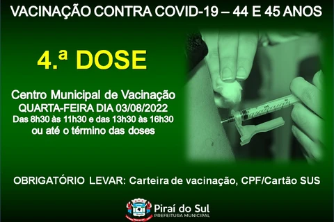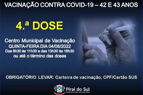 Para a semana estão programadas outras duas ações coletivas de vacinação para a aplicação da quarta dose em pessoas com idade entre 42 e 45 anos.