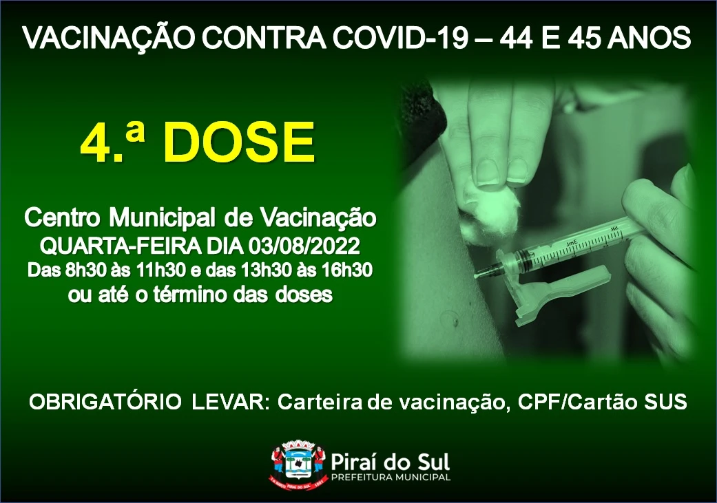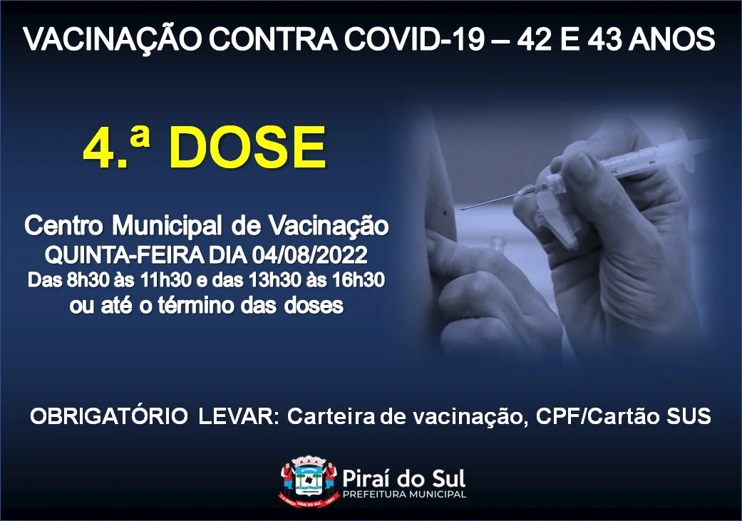 Na quarta-feira (3) a aplicação do imunizante será destinada ao público de 44 e 45 anos, enquanto na quinta será a vez das pessoas com 42 e 43 anos receberem a dose de reforço.