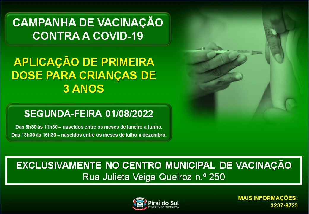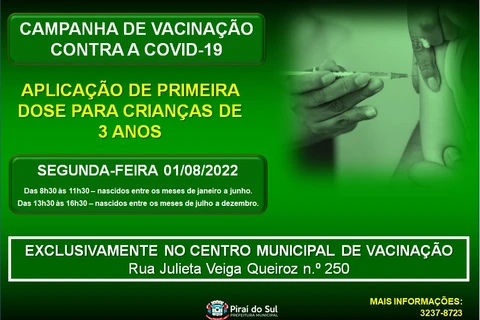 DA REDAÇÃO - A Secretaria Municipal de Piraí do Sul vacina na próxima segunda-feira, dia primeiro de agosto, crianças com 3 anos com a primeira dose da vacina contra a Covid-19.