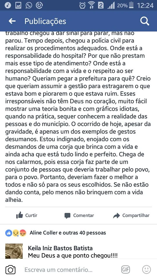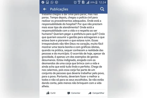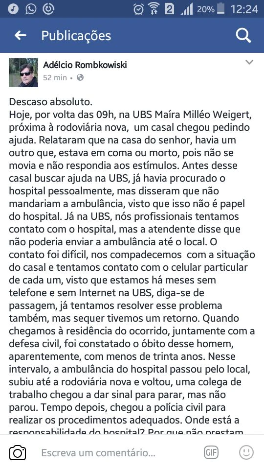De acordo com o texto publicado pelo funcionário, a equipe do hospital deveria tratar a vida dos seres humanos com respeito e responsabilidade. Adelcio citou que os contatos da equipe da Unidade Básica de Saúde com o hospital e com a Defesa Civil foram feitos com os celulares próprios dos funcionários, já que o telefone da unidade está cortado há meses, assim como também a internet.