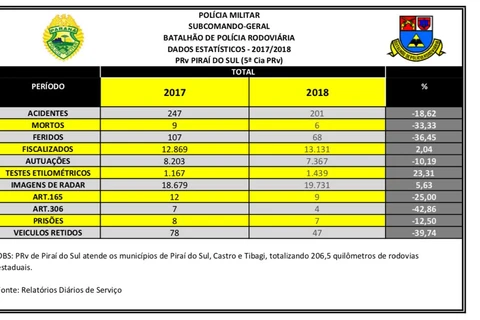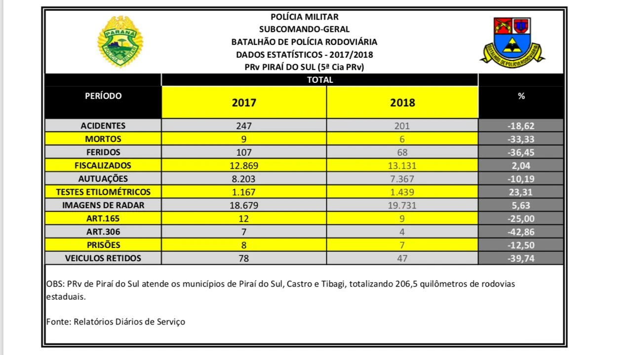 Segundo os dados divulgados pela PRE, no trecho de responsabilidade do Posto Rodoviário de Piraí do Sul, cuja extensão de 206,5 quilômetros engloba os municípios de Castro, Tibagi e Piraí, houve uma diminuição no número de acidentes entre os dois anos avaliados, passando de 247, em 2017, para 201, em 2018, o que representa uma queda de 18,62% nas ocorrências atendidas.