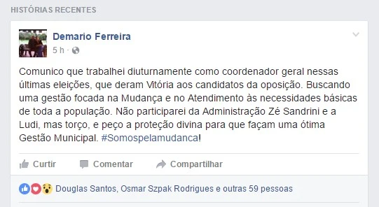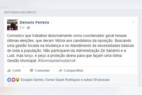 Na publicação de Demario, que aconteceu pouco antes do meio- dia de hoje, havia referência a sua atuação na coordenação geral da campanha eleitoral do então candidato a prefeito, além da afirmação pela qual deixou claro que não participaria da administração de Sandrini e da vice-prefeita, Ludi Meri Raymundo. Seu foi encerrado com o pedido de proteção divina aos atuais governantes para que estes consigam realizar uma ótima gestão municipal.