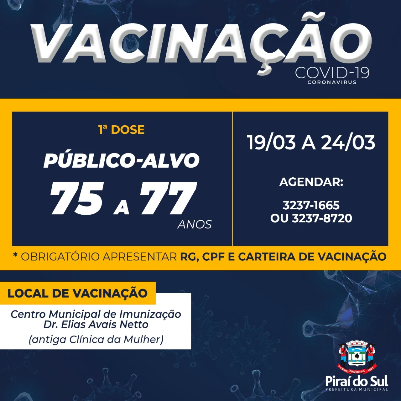 Por Pedro Dalcol Filho - A Secretaria Municipal de Saúde de Piraí do Sul informou na tarde de hoje (18), que os idosos com idade entre 75 e 77 anos começarão a receber a primeira dose da vacina contra a Covid-19 já a partir de amanhã, dia 19.