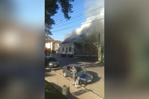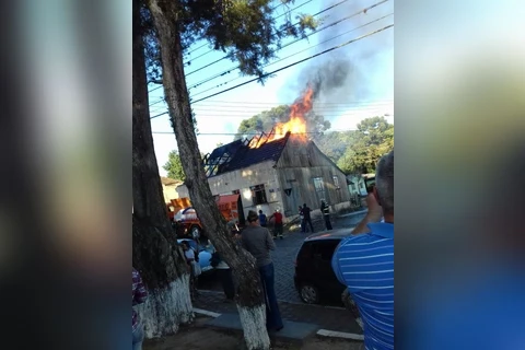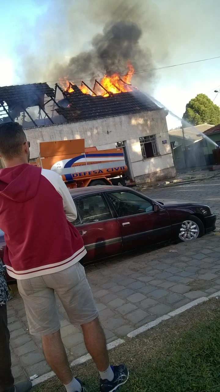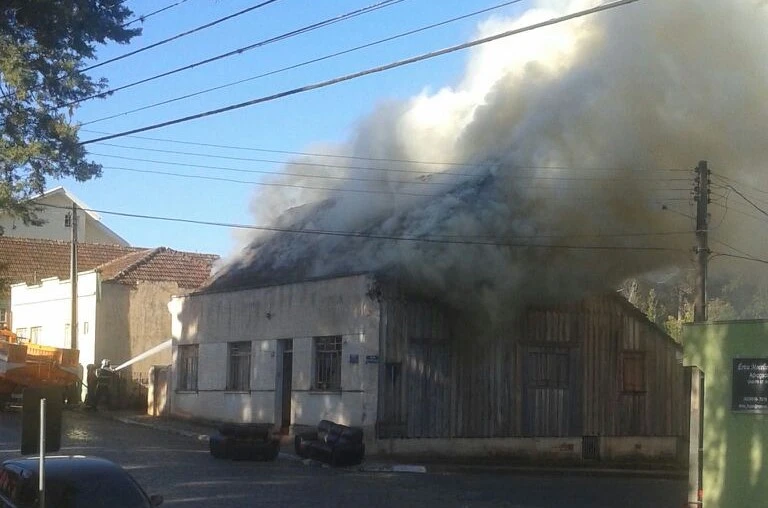 Uma das residências da Rua 15 de Novembro, na região central da cidade, foi completamente destruída pelo fogo na tarde desta segunda-feira, 24.