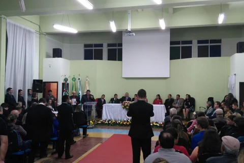 Em cerimônia realizada na noite de hoje, no Centro Administrativo Antonio Fanckin Filho, o prefeito e a vice-prefeita eleitos nas eleições suplementares do último dia 2 de abril, José Carlos Sandrini e Ludi Meri Raymundo, foram empossados em seus cargos.
