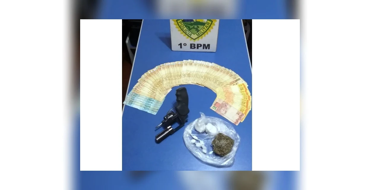 Durante revista pessoal, os policiais encontraram 0,45 gramas de cocaína, 0,75 gramas de maconha, dinheiro e um revólver calibre 38.