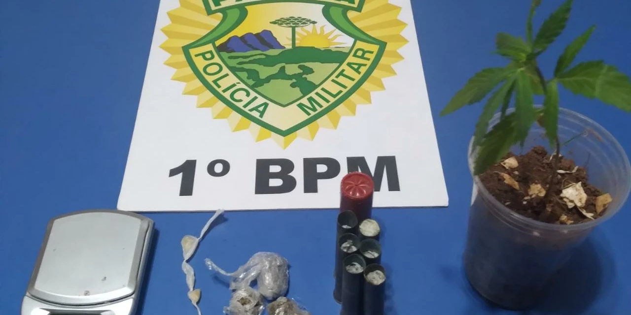 Após ser flagrado, o rapaz autorizou que os policiais vistoriassem o interior de sua residência. Na casa foram encontrados um pé de maconha plantado em um vaso, porções de maconha e crack prontas e embaladas para venda e ainda munições dos calibres 12 e 36.