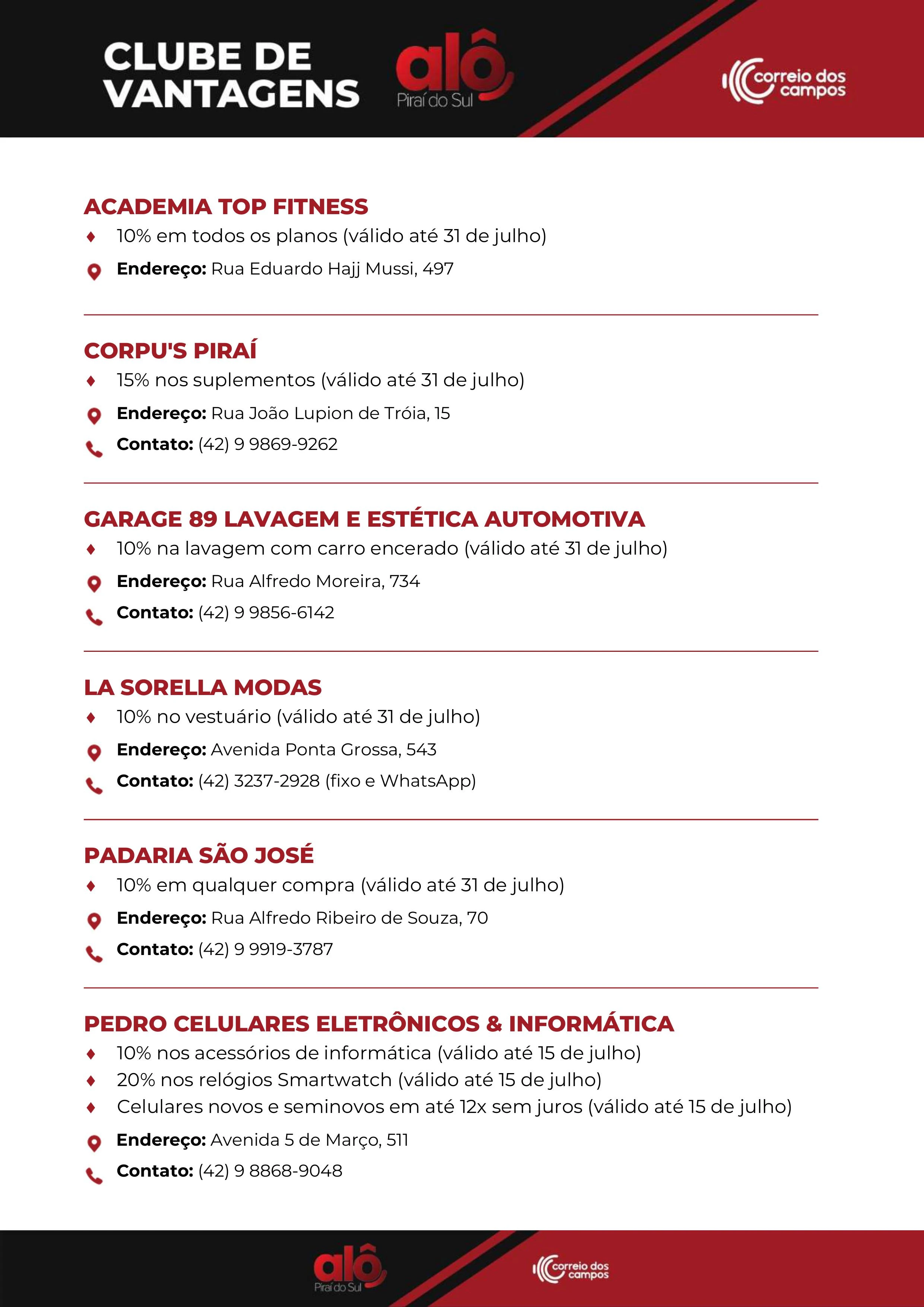 Onde tem desconto?Os leitores que aderiram ao cartão ofertado pelo Correio dos Campos têm descontos nas lojas Corpu's, La Sorella Modas e Pedro Celulares, na Padaria e Confeitaria São José, Academia Top Fitness e Garage 89 Lavagem Automotiva.