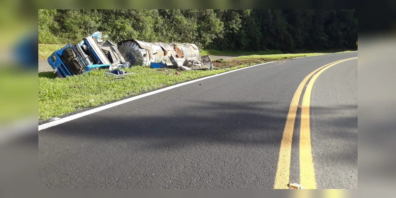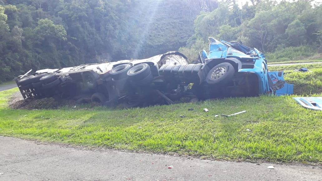 Ao perceber que o veículo tombaria, o condutor deitou na cabine para tentar se proteger. Segundo a PRE, a atitude do motorista foi fundamental para evitar algo pior, isso porque a parte superior da cabine ficou totalmente destruída e achatada.