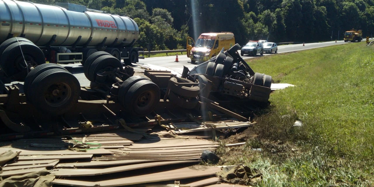 O tombamento da carga aconteceu exatamente no trecho da pista que pode ser fechado pelo DER. Por sorte, nenhum veículo de passeio aguardava para atravessar a pista contrária no momento do acidente.