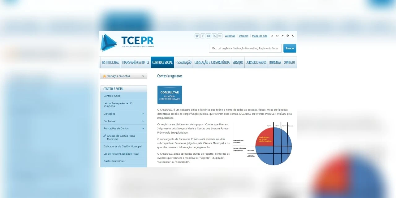 Em iniciativa pioneira, o Tribunal de Contas do Estado do Paraná (TCE-PR) passou a divulgar, no seu portal na internet, o Cadastro de Contas Irregulares (Cadirreg). É um cadastro único e histórico que reúne os nomes de todas as pessoas físicas, inclusive as falecidas, detentoras ou não de cargo ou função pública, que tiveram suas contas julgadas irregulares ou que receberam da corte parecer prévio pela irregularidade.