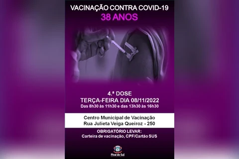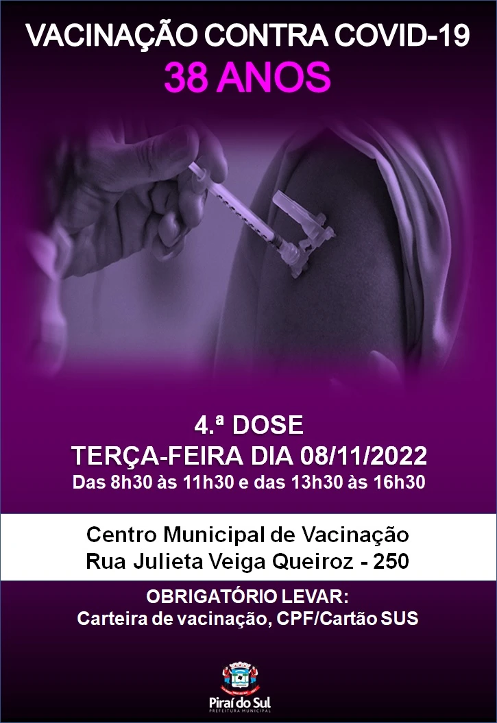 DA REDAÇÃO - A secretaria municipal de Saúde de Piraí do Sul aplica nesta terça-feira, dia 8, a quarta dose da vacina contra a Covid-19 em pessoas com 38 anos.