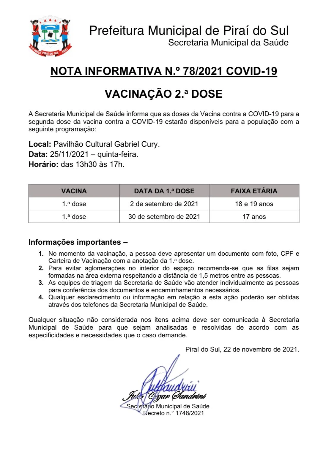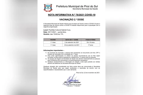 De acordo com a nota informativa divulgada pela Secretaria Municipal de Saúde na tarde de ontem, receberão a segunda dose os adolescentes de 17 anos que foram vacinados no dia 30 de setembro, além das pessoas de 18 e 19 anos que receberam a primeira dose em 2 de setembro.