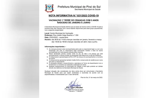DA REDAÇÃO - A Secretaria Municipal de Saúde de Piraí do Sul realiza nesta quarta-feira, dia 23, o mutirão de vacinação para aplicação da primeira dose da vacina contra a Covid-19 em crianças com 5 anos.