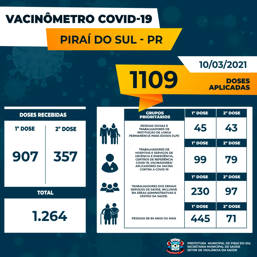 De acordo com o relatório desta quarta-feira (10), um total de 1109 pessoas já receberam doses da vacina. A primeira dose foi aplicada em 819 piraienses, enquanto outros 290 receberam a segunda imunização.