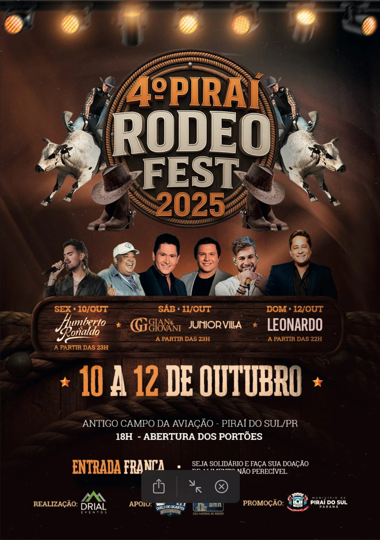 COM ASSESSORIAS - Vem aí um dos eventos mais esperados do ano. Entre os dias 10 e 12 de outubro, acontece o 4º Piraí Rodeo Fest, promovido pela Drial Eventos em parceria com a Prefeitura Municipal de Piraí do Sul. A festa será realizada no Antigo Campo de Aviação, no Bairro das Brotas, com entrada gratuita em todos os dias.